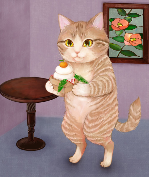 猫鏡餅のイラスト 猫好きさんの年賀状に W 手書き和猫